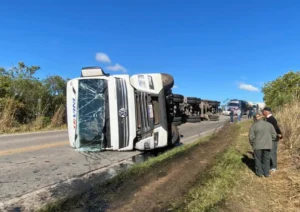 Família é socorrida pelo SAMU após caminhão tombar na BR-265
